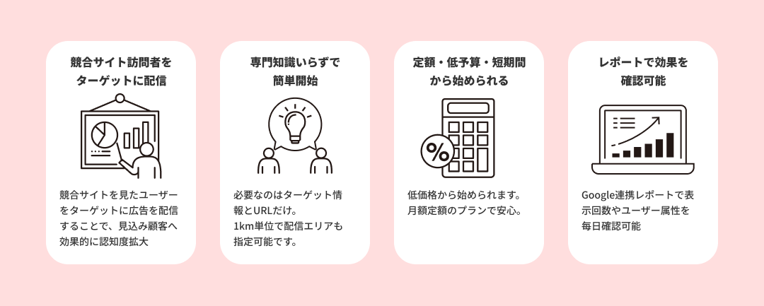 競合他社のサイトに訪問したユーザーをターゲットに広告を配信し、自分のサイトに誘導できる、認知度向上のためのWeb広告です。